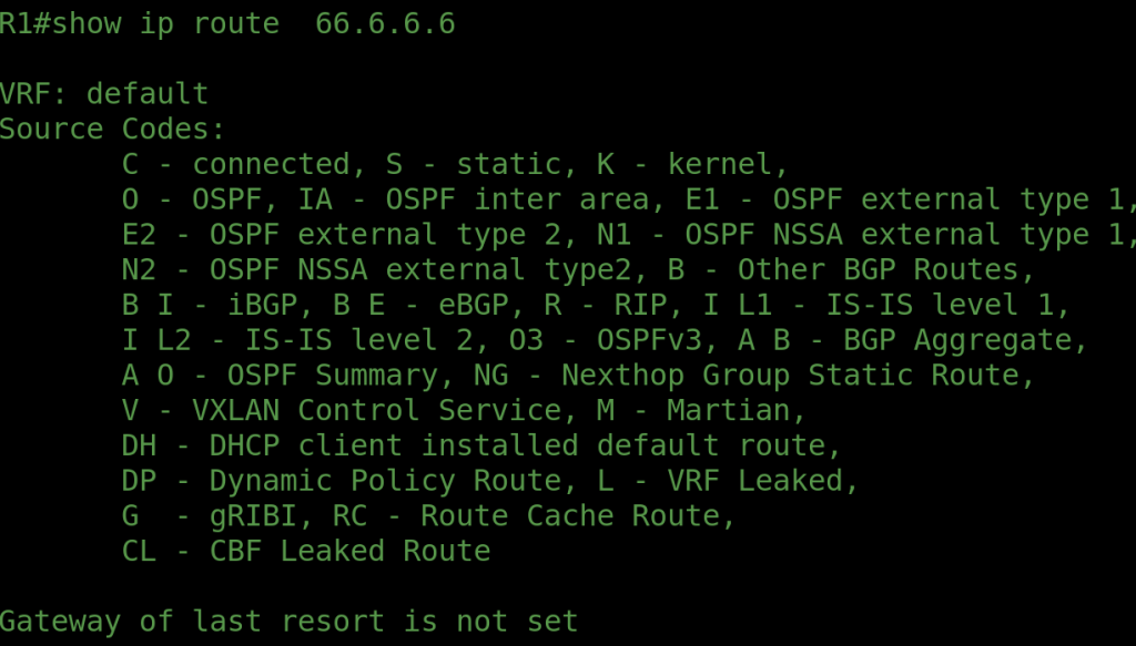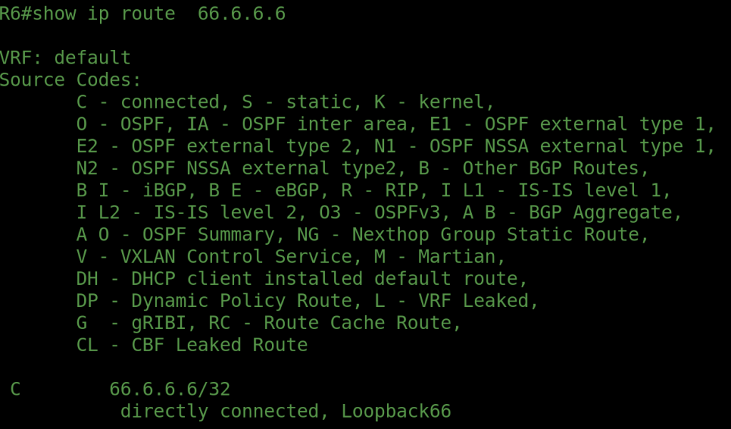 As you see below, there is no route for 66.6.6.6 in R1 before implementation.R6 is not advertising it.