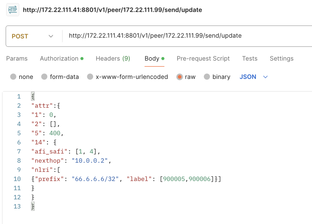 API endpoint is http://172.22.111.41:8801/v1/peer/172.22.111.99/send/update. Please check body carefully: