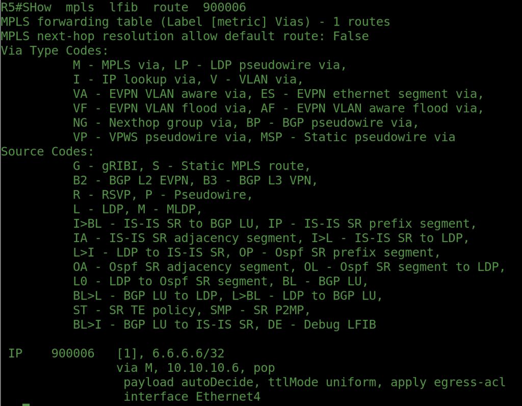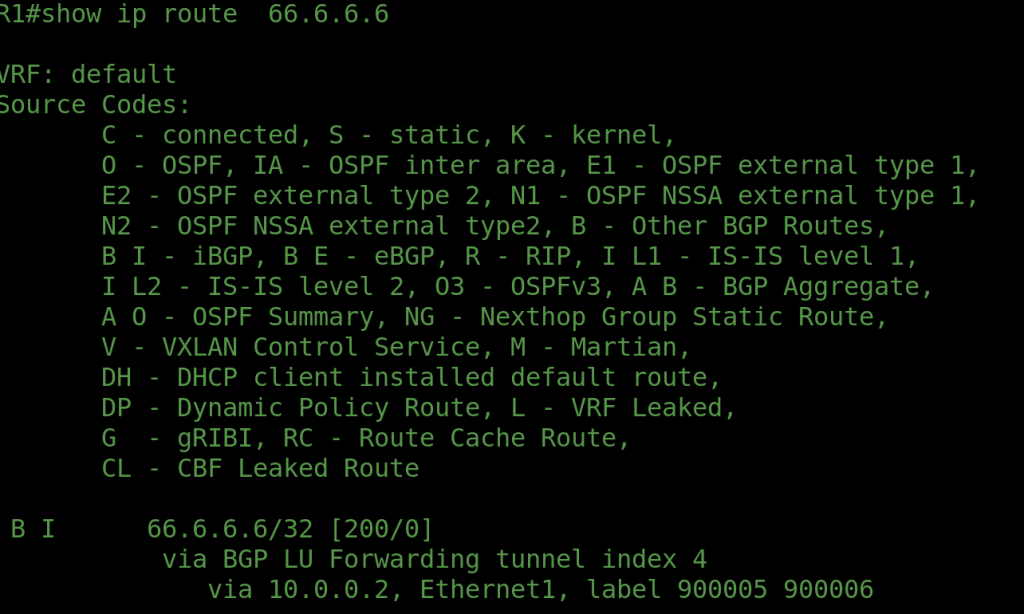 After post, let’s check R1 route table: As you see below, R1 will make label to packet for destination 66.6.6.6.