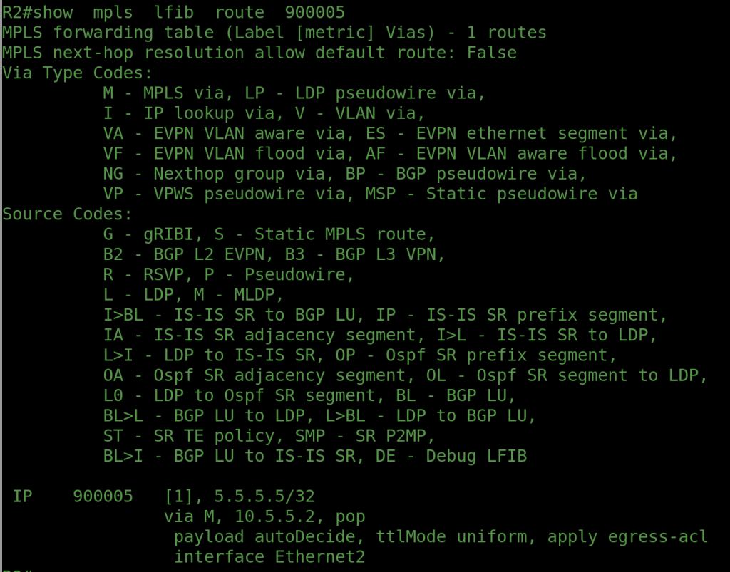 As soon as R2 receives the packet, it will check its label forwading table. Since the packet has 900005 on top of label field, it will be popped according to forwarding table. 900005 will be removed, 900006 will remain on packet’s label field. Now, the packet will send to R5.10.5.5.2 is R5.