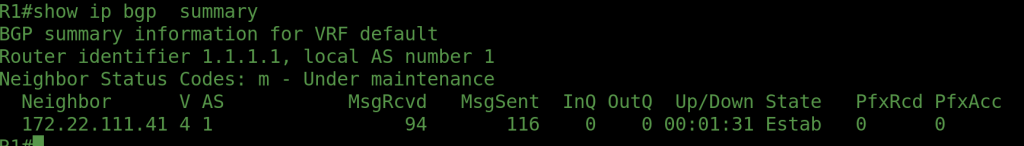 We will establish BGP on management interface of R1 router and controller interface. yaBGP configuration will be as below: